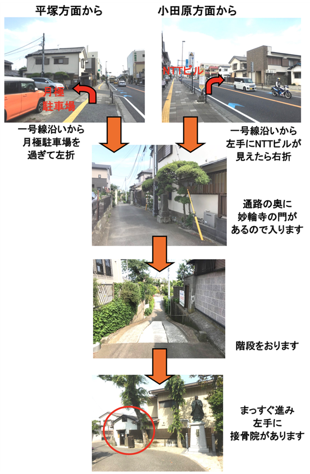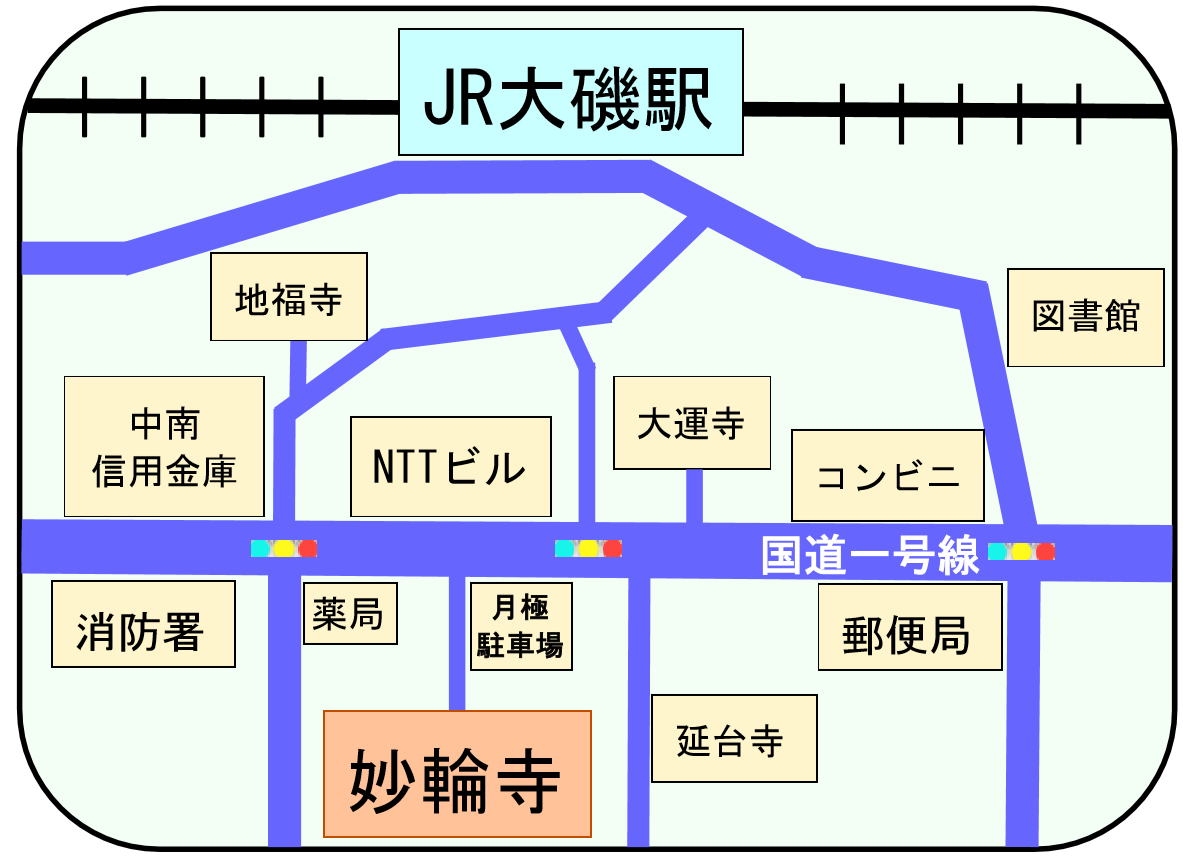 駐車場は接骨院の隣に二台分ございますが、満車の場合は妙輪寺の駐車場に停めてください。